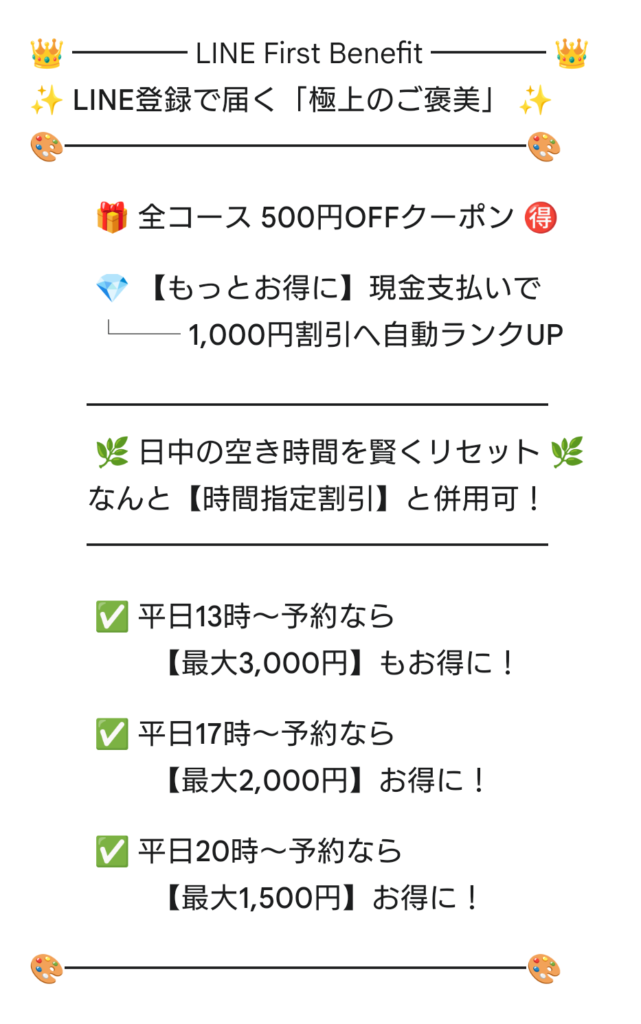 電話・LINE予約は事務手数料として【+1000円】加算。🚫 【外国人入店不可 / Foreigners Not Allowed】🌈 ジェンダーレス・男性歓迎。ただし、メンズエステ店とは趣旨が異なります。